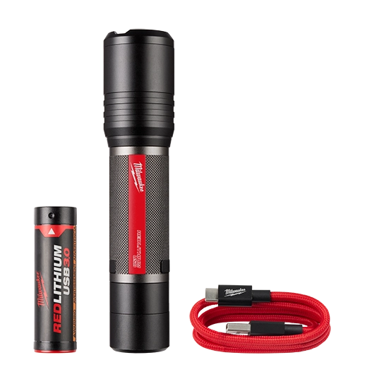 Linterna de enfoque giratorio de 2,000 lúmenes recargable mediante USB REDLITHIUM™ alimentada con USB REDLITHIUM™ ofrece iluminación HIGH OUTPUT™ que se mantiene más brillante por más tiempo